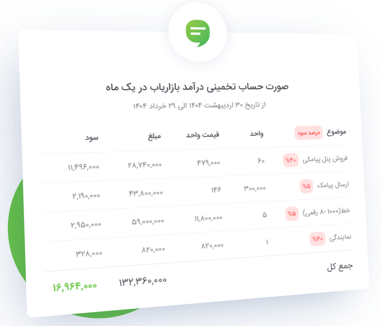 اگر در هر روز کاری فقط یک پنل پیامکی بفروشید، با در نظر گرفتن ۲۴ روز کاری در ماه، در پایان ماه حداقل ۲۴ پنل فروخته‌اید. این مقدار، پایه‌ترین سطح فروش شماست و با کمی تلاش بیشتر، به‌راحتی قابل افزایش است.